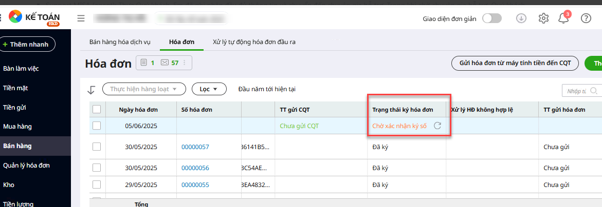 Vào phân hệ Bán hàng, tab Hóa đơn, trên danh sách hóa đơn tại cột Trạng thái ký hóa đơn, với dòng của Hóa đơn đang bị trạng thái Chưa ký/Chờ ký/Chờ xác nhận ký số, anh/chị nhấn mũi tên xoay tròn (⟳) để cập nhật trạng thái phát hành hóa đơn mới nhất. Sau đó kiểm tra lại: Trạng thái ký hóa đơn, Mã của CQT cấp,…