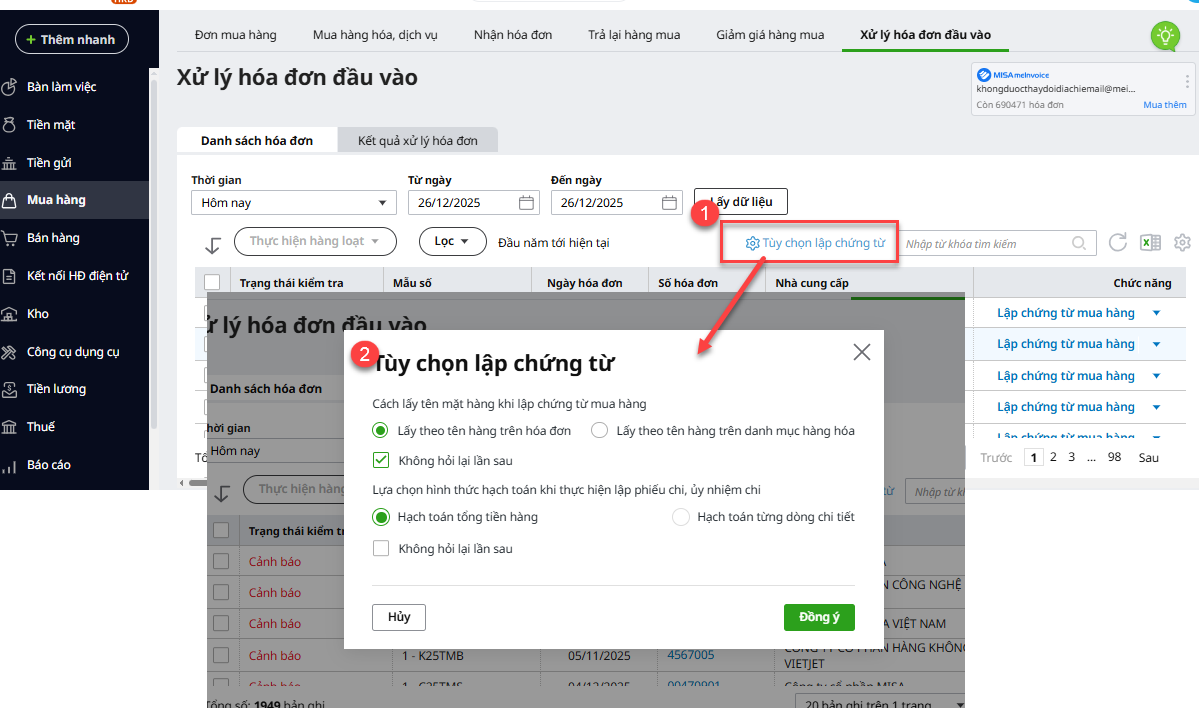 • Thiết lập tùy chọn chứng từ: tại giao diện ở tab Xử lý hóa đơn đầu vào, anh/chị tích vào bánh răng Tùy chọn lập chứng từ.