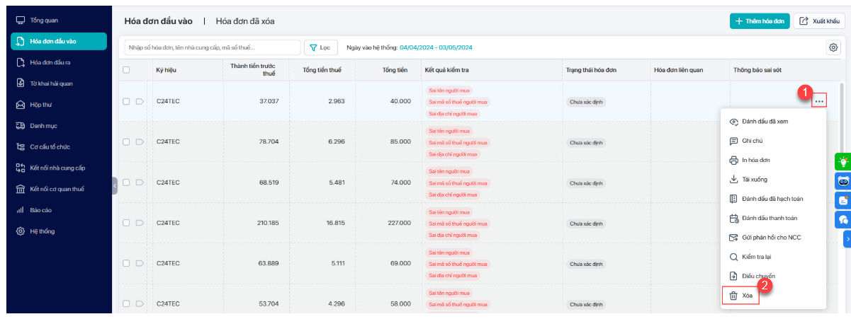 Lưu ý: Nếu muốn xóa các hóa đơn ở danh sách Xử lý hóa đơn đầu vào do gửi nhầm đến hoặc tải về sai thì anh/chị đăng nhập lại trang web meInvoice – Xử lý hóa đơn – nhấn biểu tượng 3 chấm ở cuối dòng hóa đơn muốn xóa và nhấn Xóa. Chi tiết xem hướng dẫn tại đây.