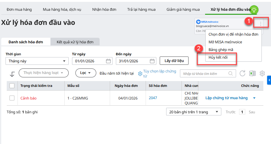 • Nếu anh/chị muốn hủy kết nối dịch vụ Xử lý hóa đơn đầu vào thì anh/chị vào phân hệ Mua hàng, tab Xử lý hóa đơn đầu vào, tại phần thông tin kết nối MISA meInvoice góc phải trên cùng anh/chị tích dấu 3 chấm nhấn Hủy kết nối.