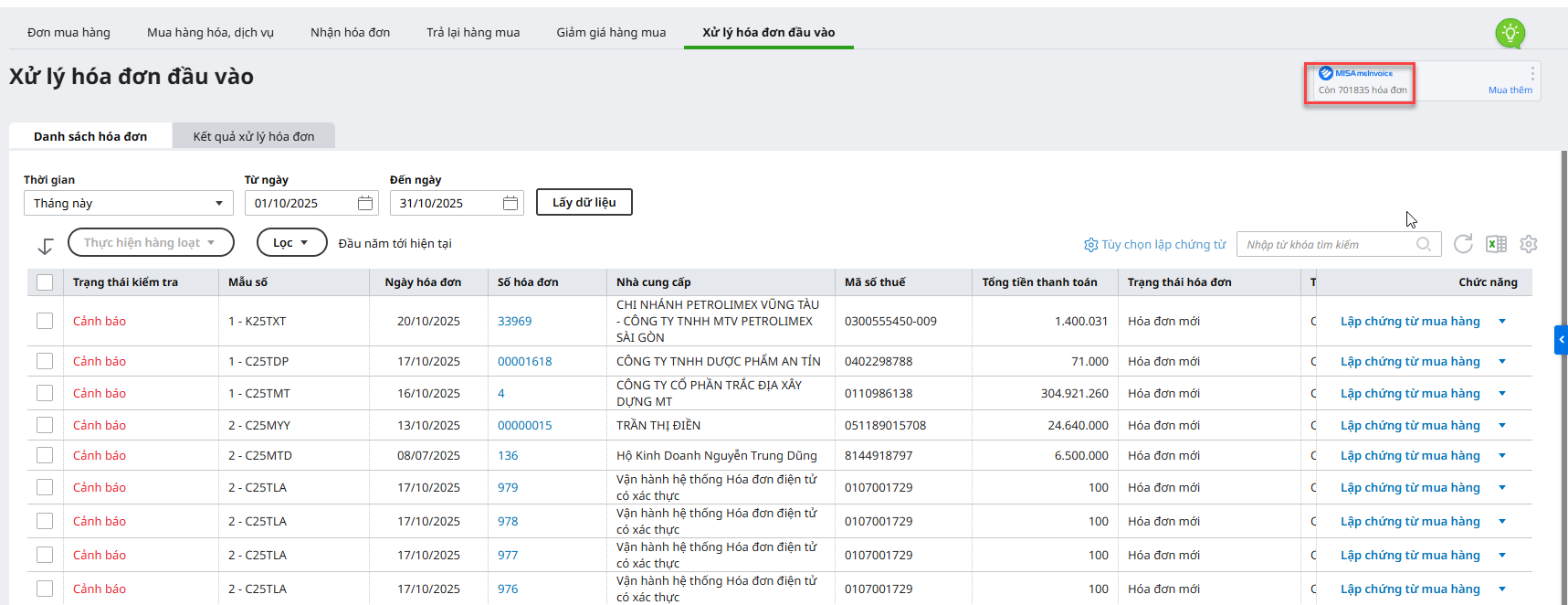 Bước 4: Sau khi kết nối thành công, chương trình sẽ tự động lấy về danh sách hóa đơn đầu vào từ MISA meInvoice.