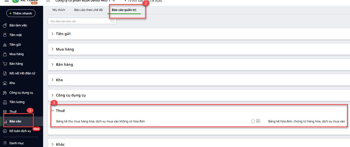 Bước 1: Vào Báo cáo\Báo cáo quản trị\Thuế.