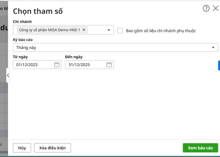Bước 2: Chọn báo cáo sau đó thiết lập tham số báo cáo: Chi nhánh, Kỳ báo cáo sau đó nhấn Xem báo cáo.