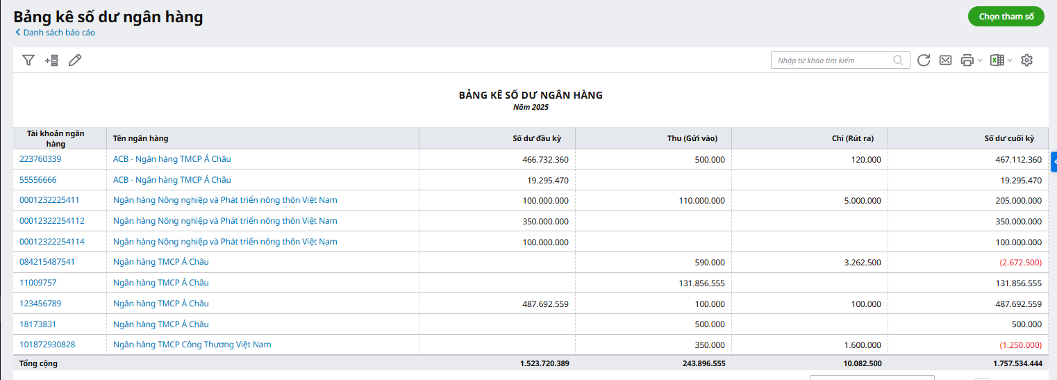 Để xem báo cáo Bảng kê số dư ngân hàng, anh/chị thực hiện như sau: