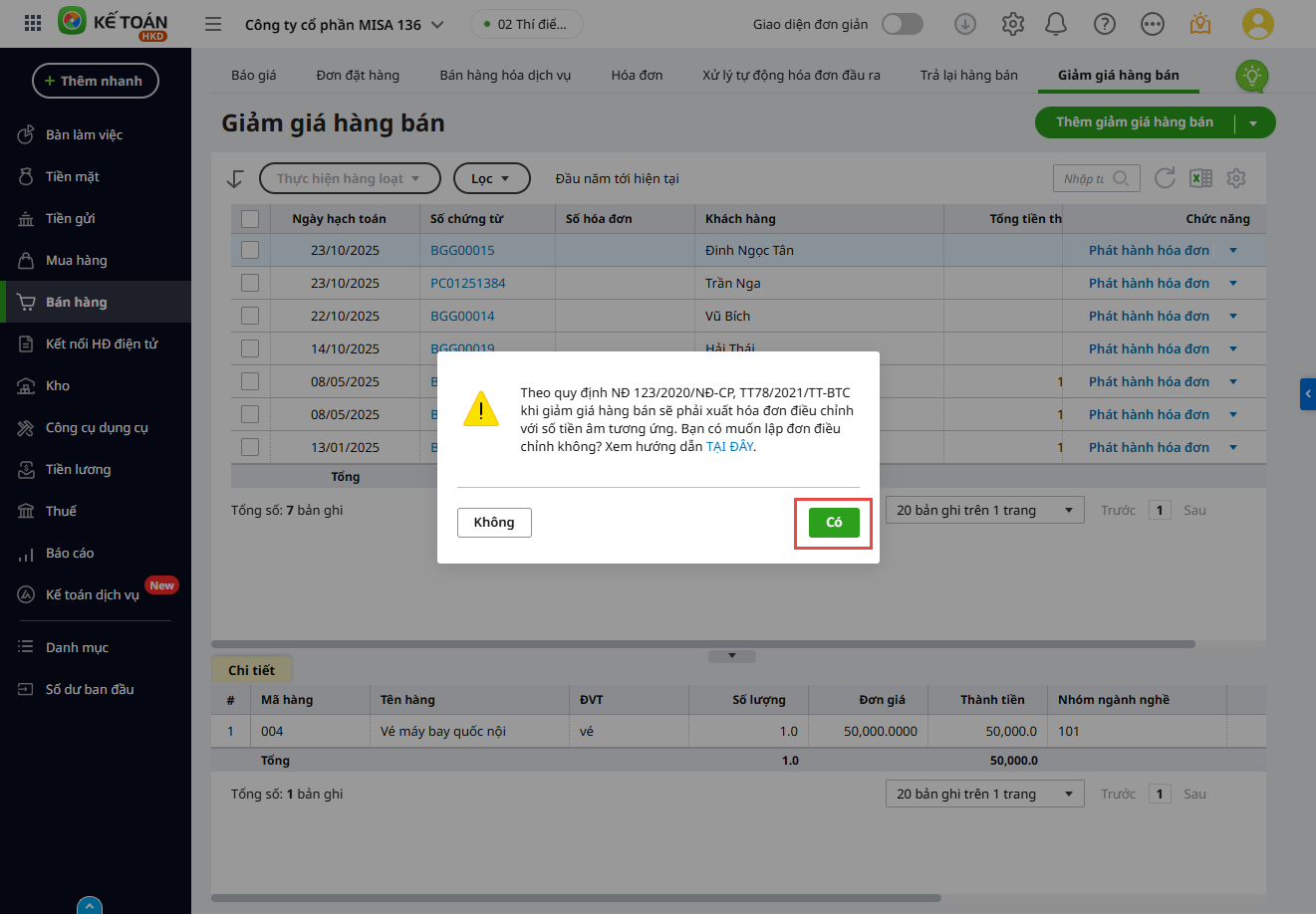 Cách 1: Tại giao diện danh sách chứng từ Giảm giá hàng bán, dòng chứng từ cần lập, nhấn vào dòng Phát hành hóa đơn. Phần mềm hiển thị cảnh báo yêu cầu lập và phát hành hóa đơn điều chỉnh. Sau đó, nhấn Có để tiếp tục