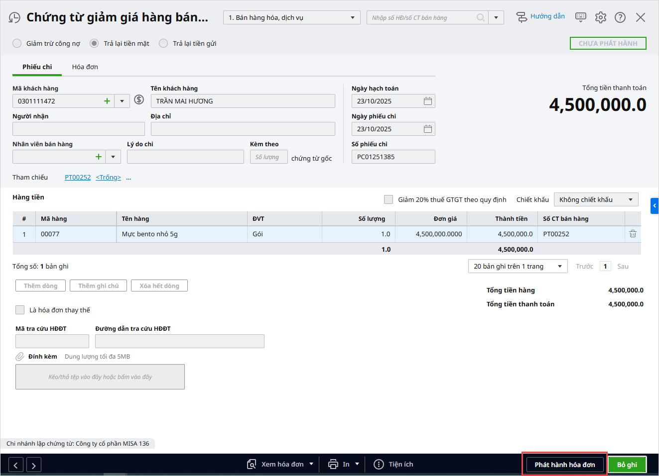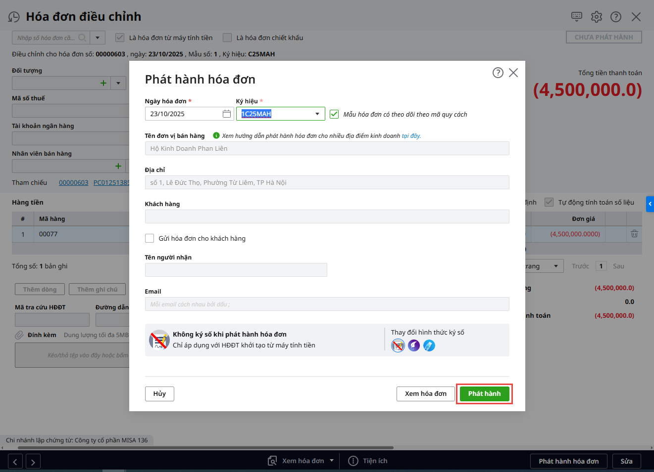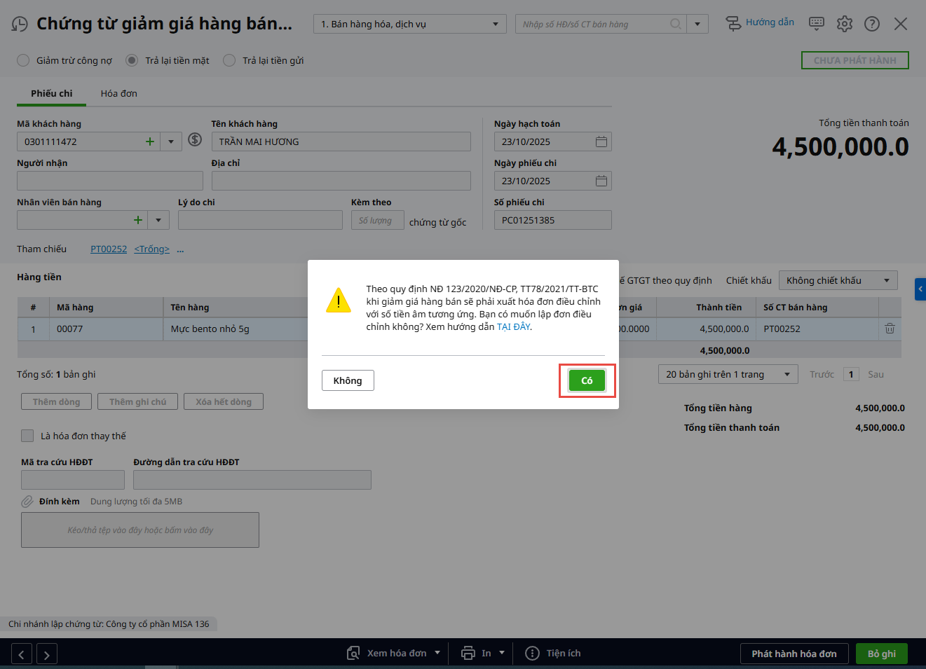 Cách 2: Nhấp vào chứng từ để mở giao diện chi tiết chứng từ , chọn Phát hành hóa đơn. Khi phần mềm hiển thị cảnh báo, nhấn Có để lập hóa đơn điều chỉnh.