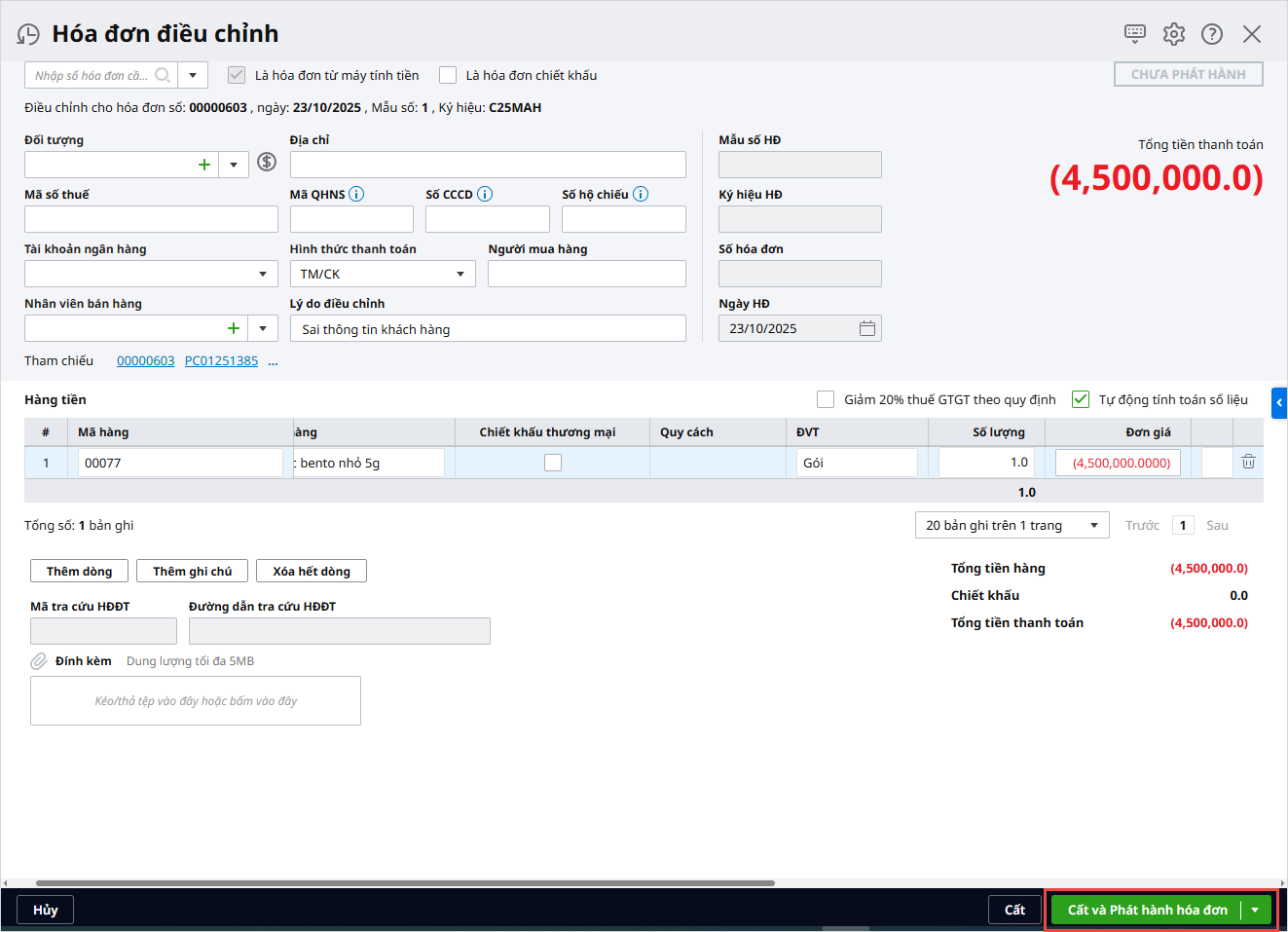 Bước 3: Anh/chị kiểm tra và điều chỉnh lại thông tin hóa đơn. Sau đó, nhấn Cất và Phát hành hóa đơn.