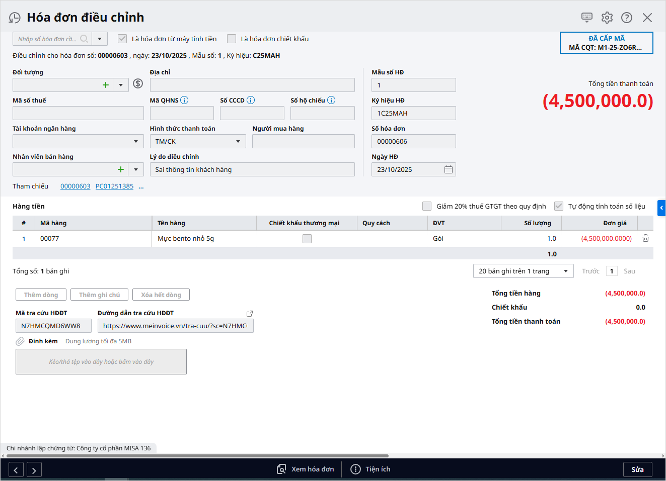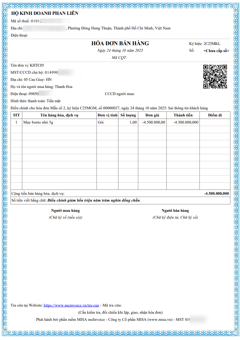 - Sau khi phát hành thành công, hóa đơn điều chỉnh sẽ hiển thị như hình dưới đây.
