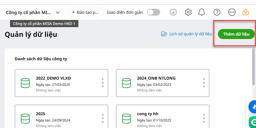 - Hoặc trên giao diện Tổng quan nhấn vào dữ liệu kế toán đang làm việc để xem danh sách dữ liệu kế toán: