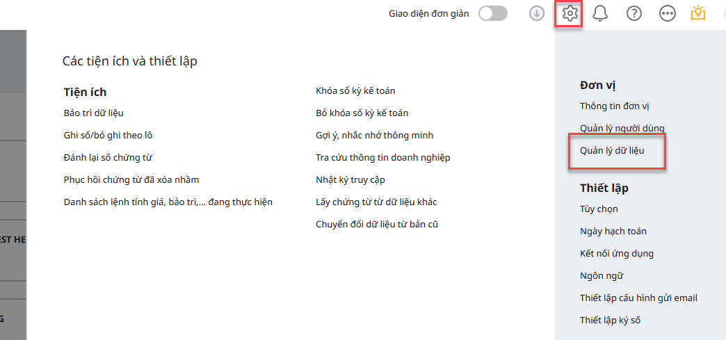 Bước 1: Vào bánh răng (⚙) Các tiện ích và thiết lập, chọn Quản lý dữ liệu