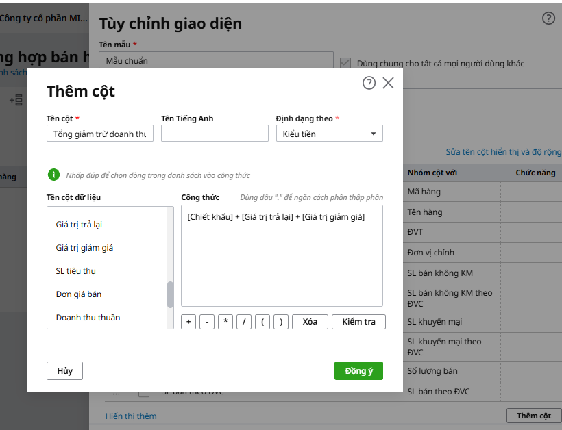 - Thiết lập công thức cho cột cần thêm: nhấn chuột vào tên cột dữ liệu để lấy lên công thức, sau đó dùng phép tính +, -, *, /, (, ) để thiết lập. Ví dụ: cột Tổng giảm trừ doanh thu được tính theo công thức: [Chiết khấu] + [Giá trị trả lại] + [Giá trị giảm giá] (có nghĩa là bằng cột Chiết khấu cộng gọi cột Giá trị trả lại cộng với cột Giá trị giảm giá)
