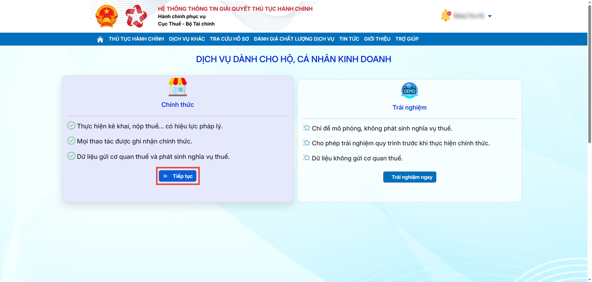 Bước 2: Tại màn Dịch vụ dành cho hộ, cá nhân kinh doanh, nhấn Tiếp tục.