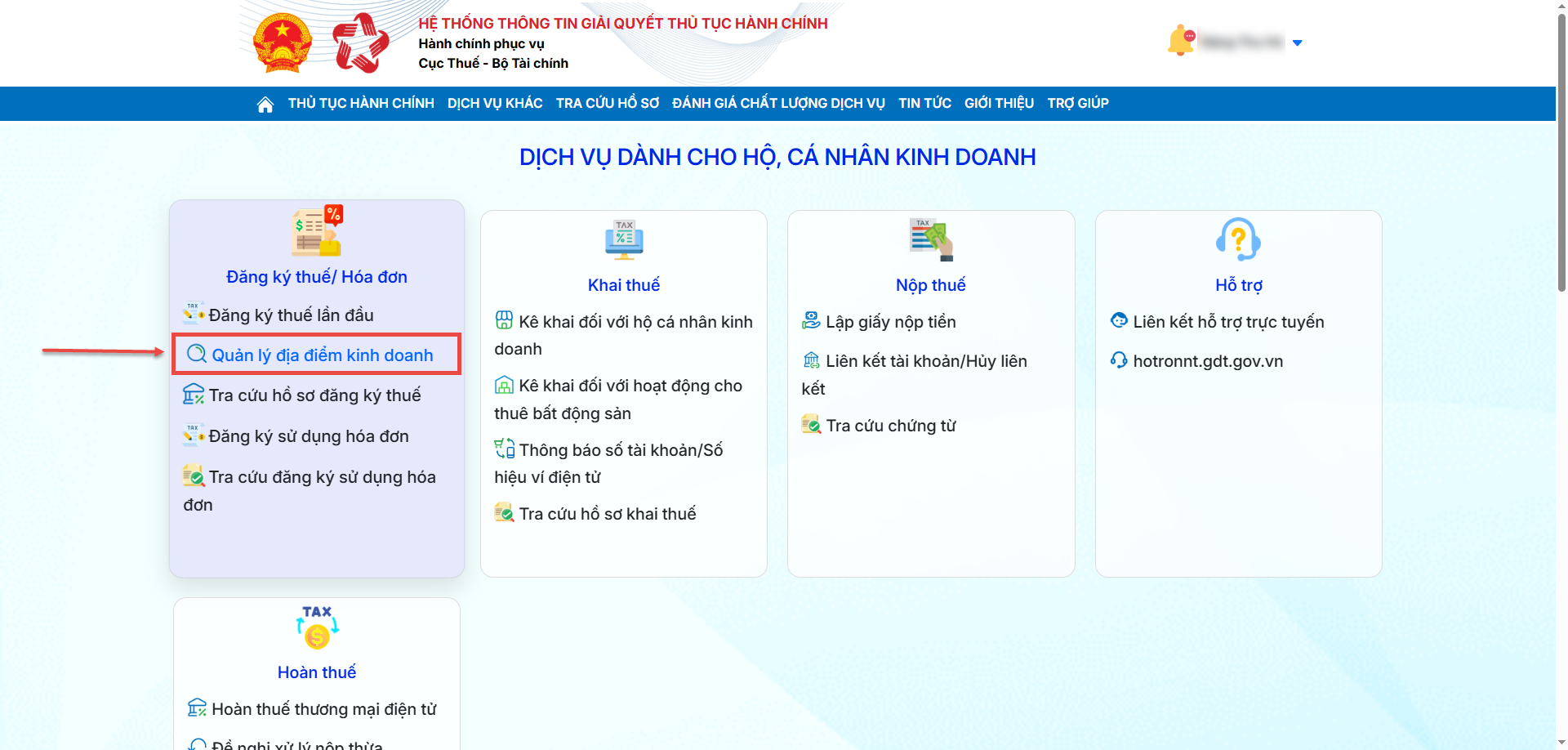 Tại trang chủ giao diện vừa đăng nhập vào trang, anh/chị chọn Hộ, cá nhân kinh doanh.