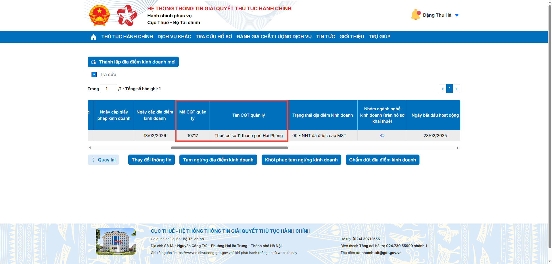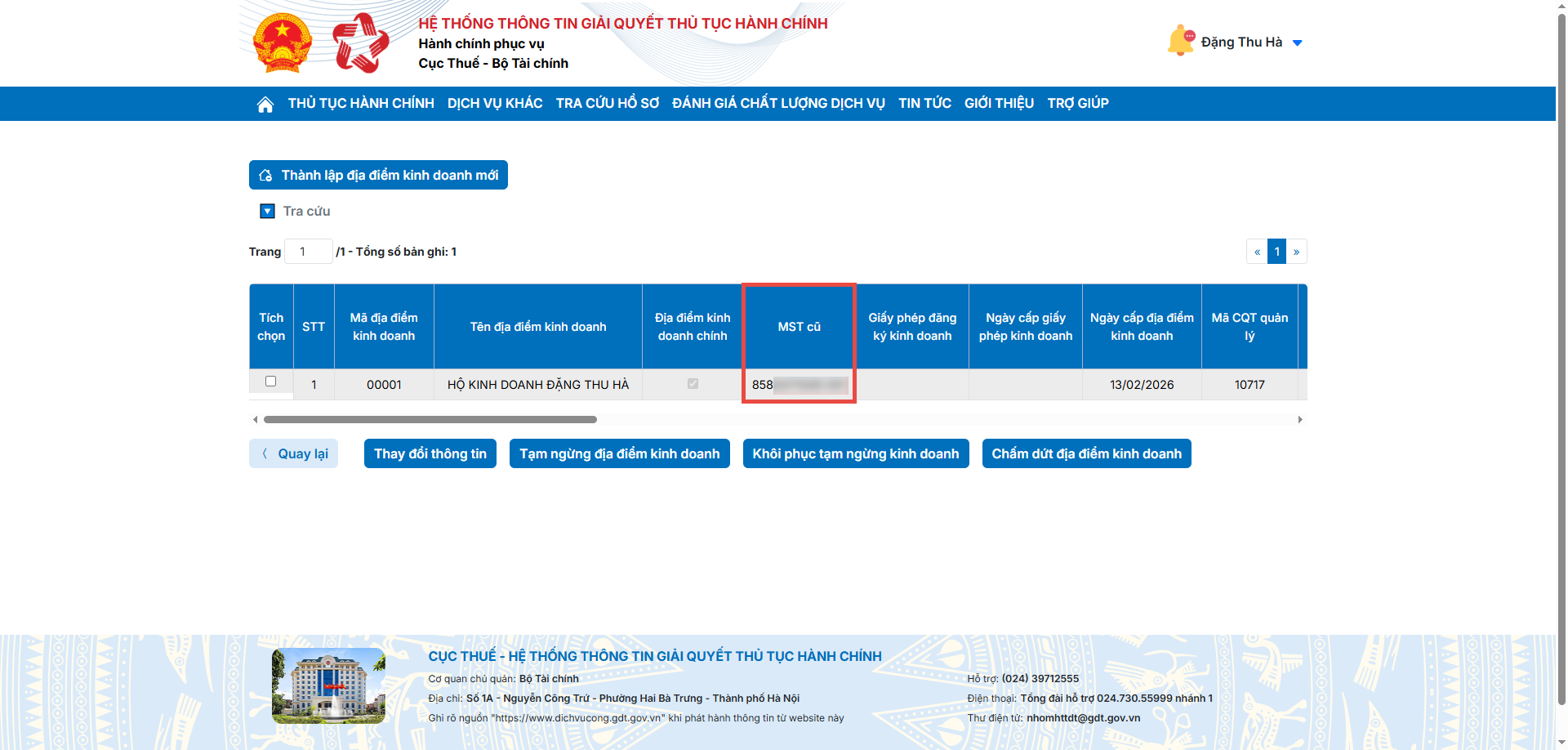 Bước 4: Tại đây, hệ thống sẽ hiển thị danh sách các địa điểm kinh doanh đã đăng ký. Anh/chị xem thông tin MST cũ, Mã CQT quản lý và Tên CQT quản lý tại cột tương ứng để phục vụ cho việc kê khai.