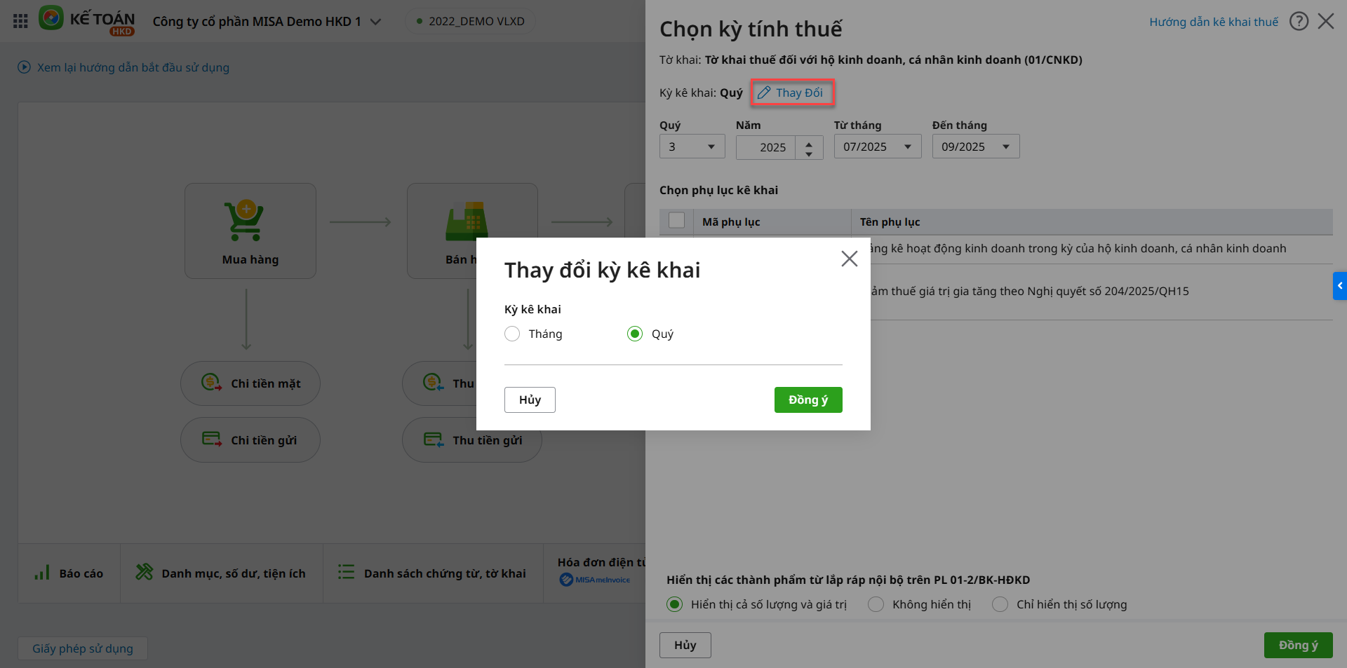 Tại đây, có thể thay đổi kỳ kê khai theo tháng hoặc theo quý: