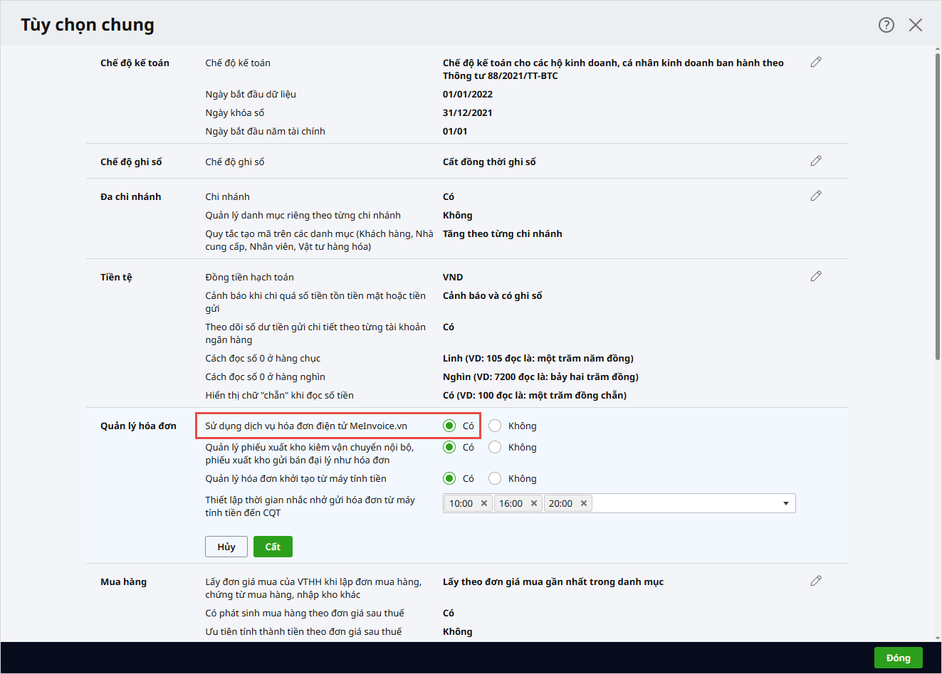 Lưu ý: Mã số thuế sử dụng để kết nối với MISA meInvoice phải trùng với mã số thuế khai báo tại phần Thiết lập\Thông tin đơn vị trên AMIS Kế toán HKD.