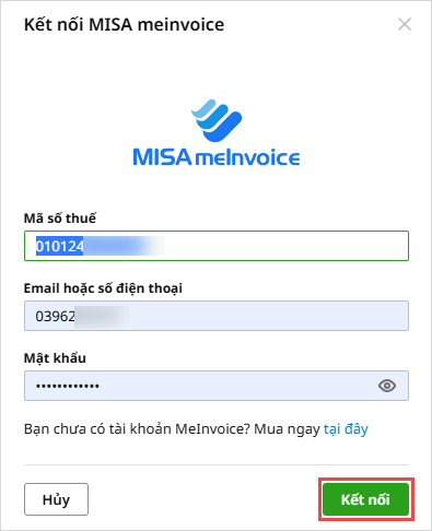 – Nhập thông tin đăng nhập tài khoản MISA meInvoice, sau đó nhấn Kết nối.