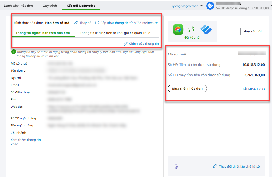 Đồng thời giao diện của tab Kết nối hóa đơn điện tử lúc này sẽ thể hiện thông tin hóa đơn mà anh/chị đang sử dụng, bao gồm: Hình thức hóa đơn, Thông tin người bán trên hóa đơn, Thông tin liên hệ trên tờ khai gửi cơ quan Thuế. Anh/chị có thể tích Thay đổi, Cập nhật thông tin từ MISA meInvoice, Chỉnh sửa thông tin theo nhu cầu.