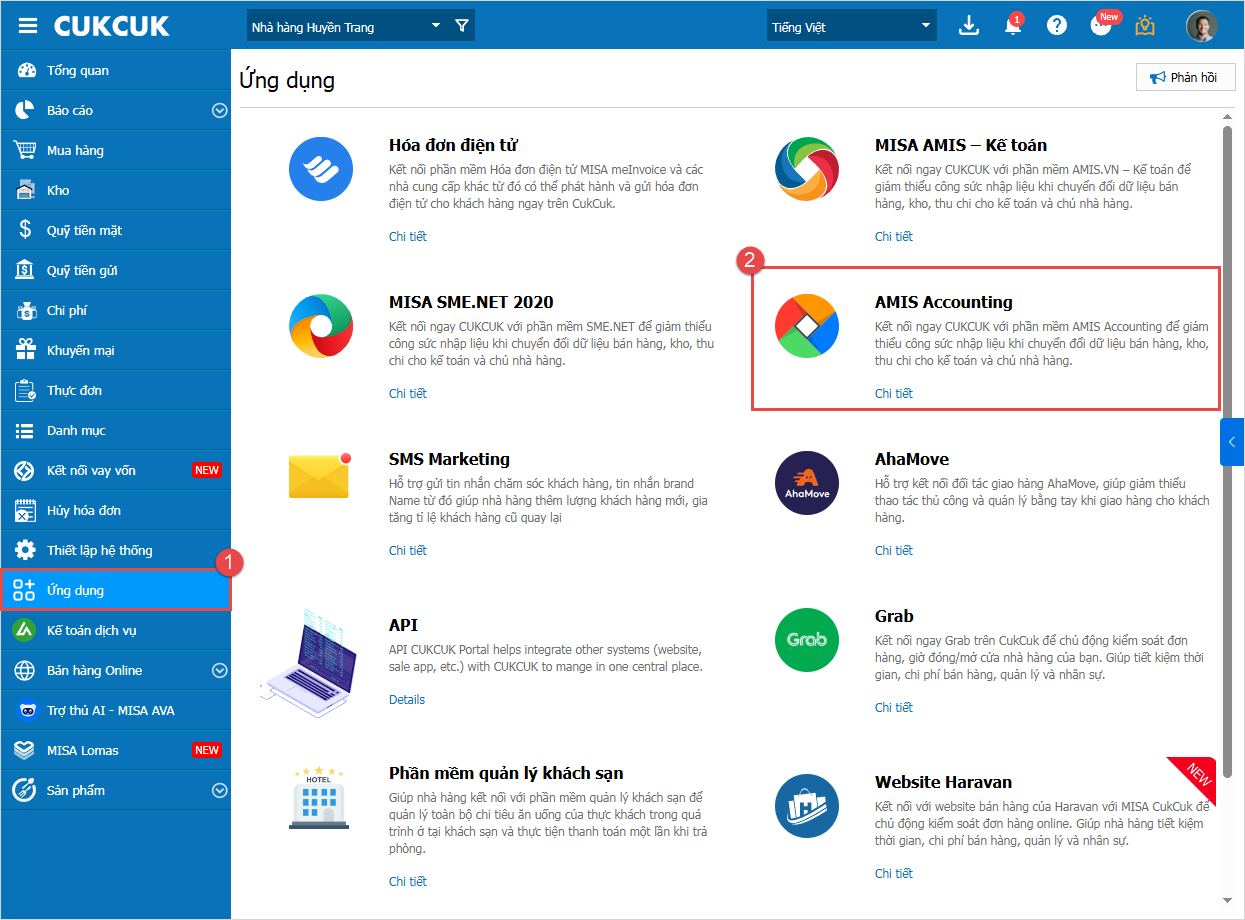 1. Đăng nhập vào MISA CukCuk, chọn Ứng dụng/AMIS Accounting