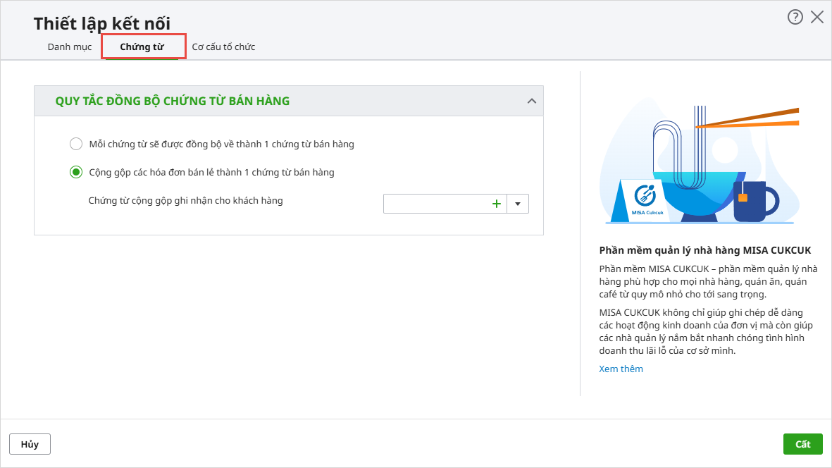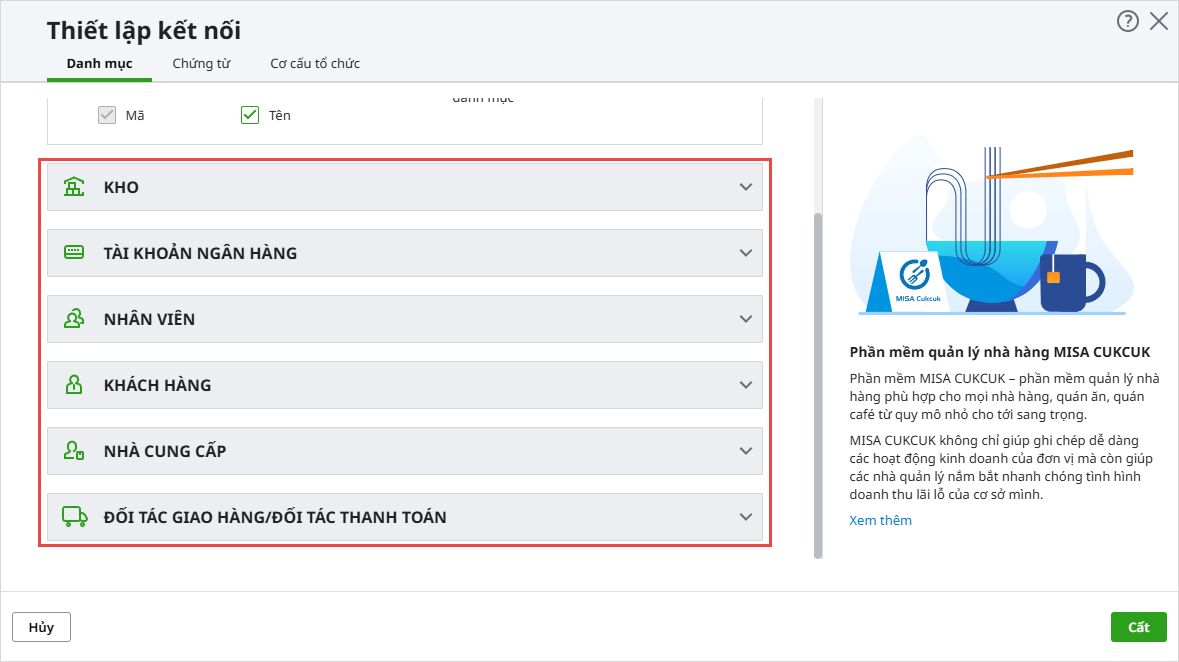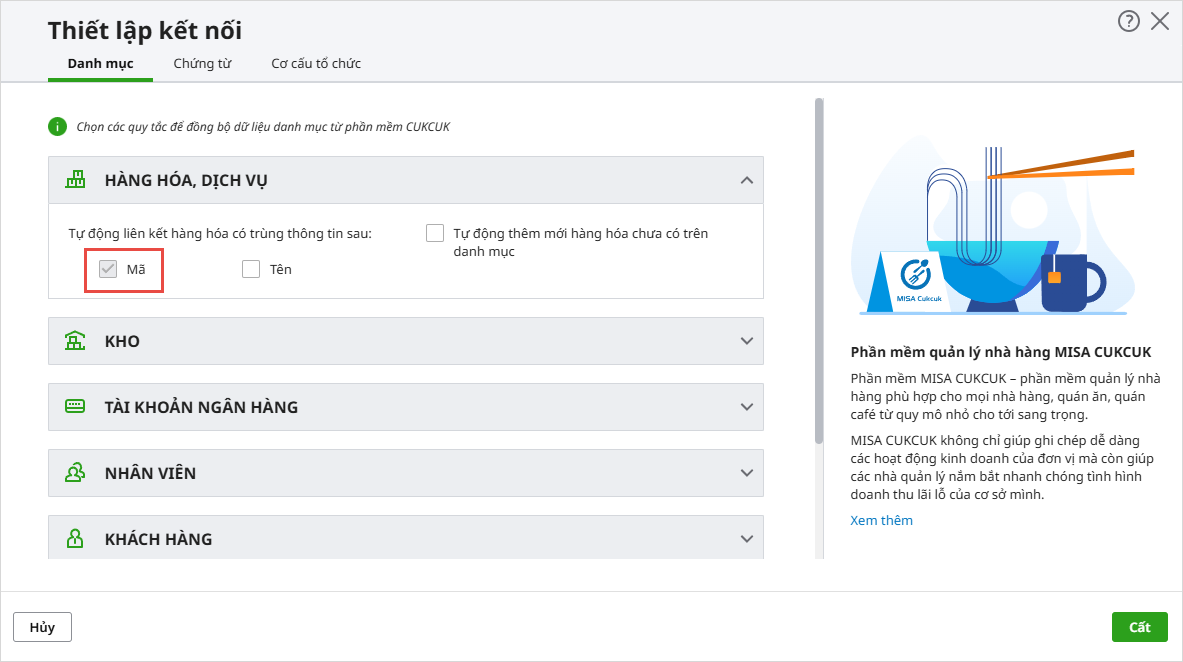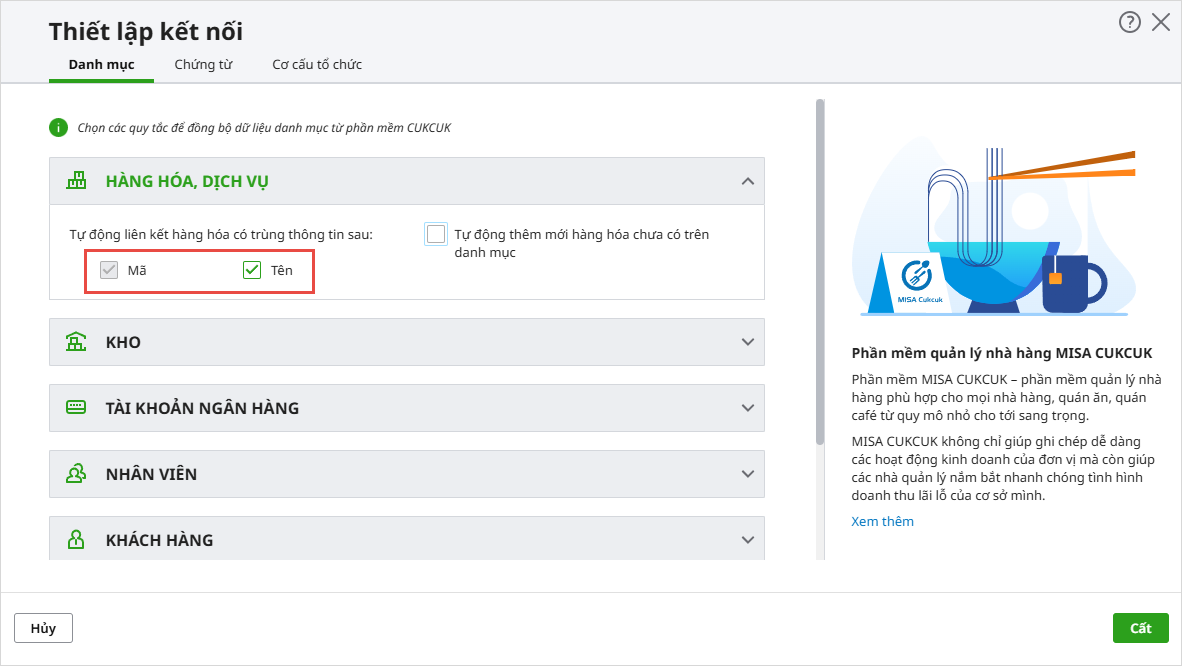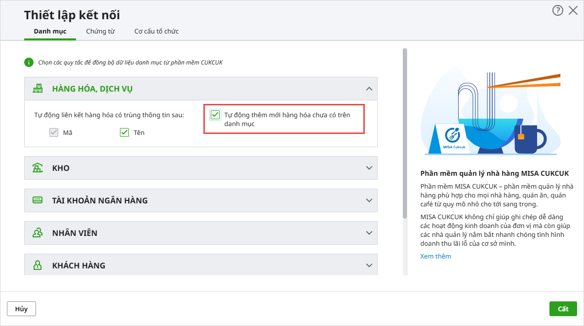 – Tương tự, người dùng cũng có thể thiết lập quy tắc tự động liên kết danh mục giữa AMIS Kế toán HKD và CukCuk với các thông tin như: