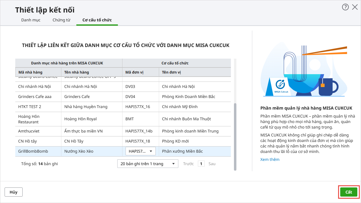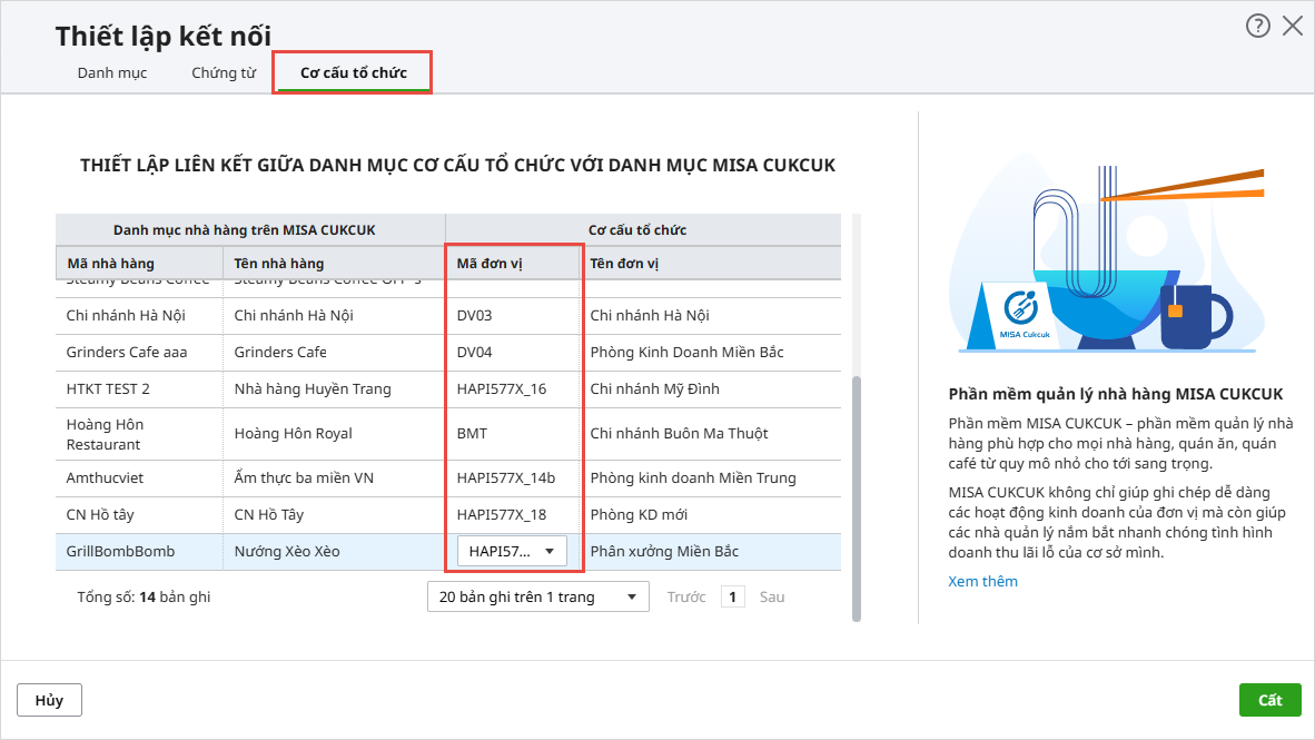 3. Tại tab Cơ cấu tổ chức, thực hiện thiết lập liên kết giữa danh mục cơ cấu tổ chức với danh mục nhà hàng: