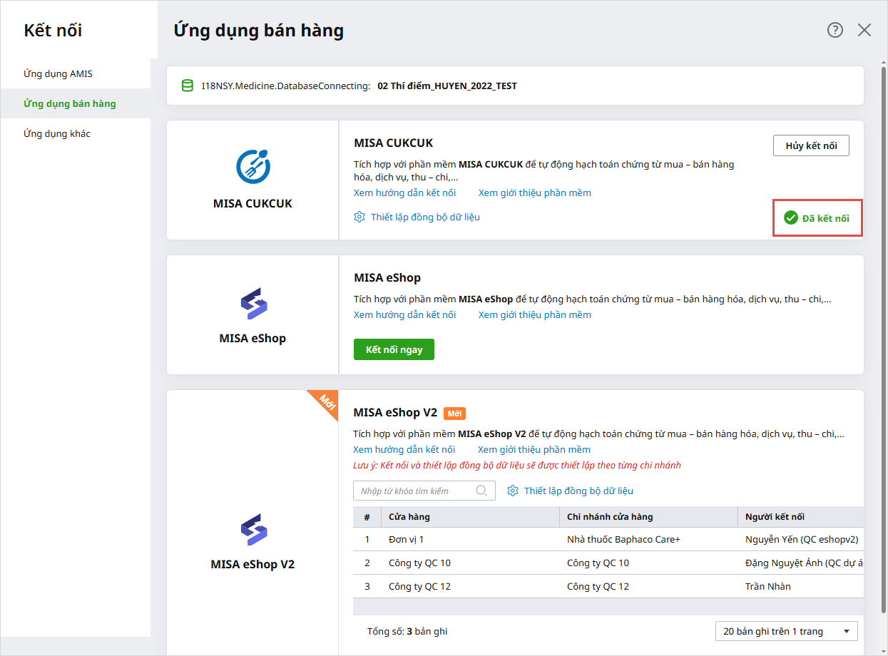 Lúc này chương trình sẽ hiển thị thông tin kết nối thành công giữa AMIS Kế toán HKD và MISA CukCuk