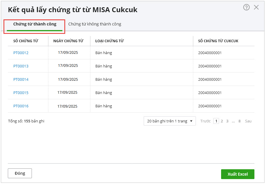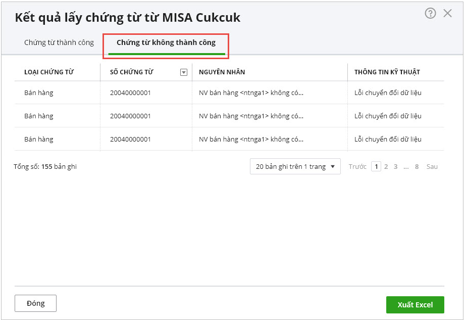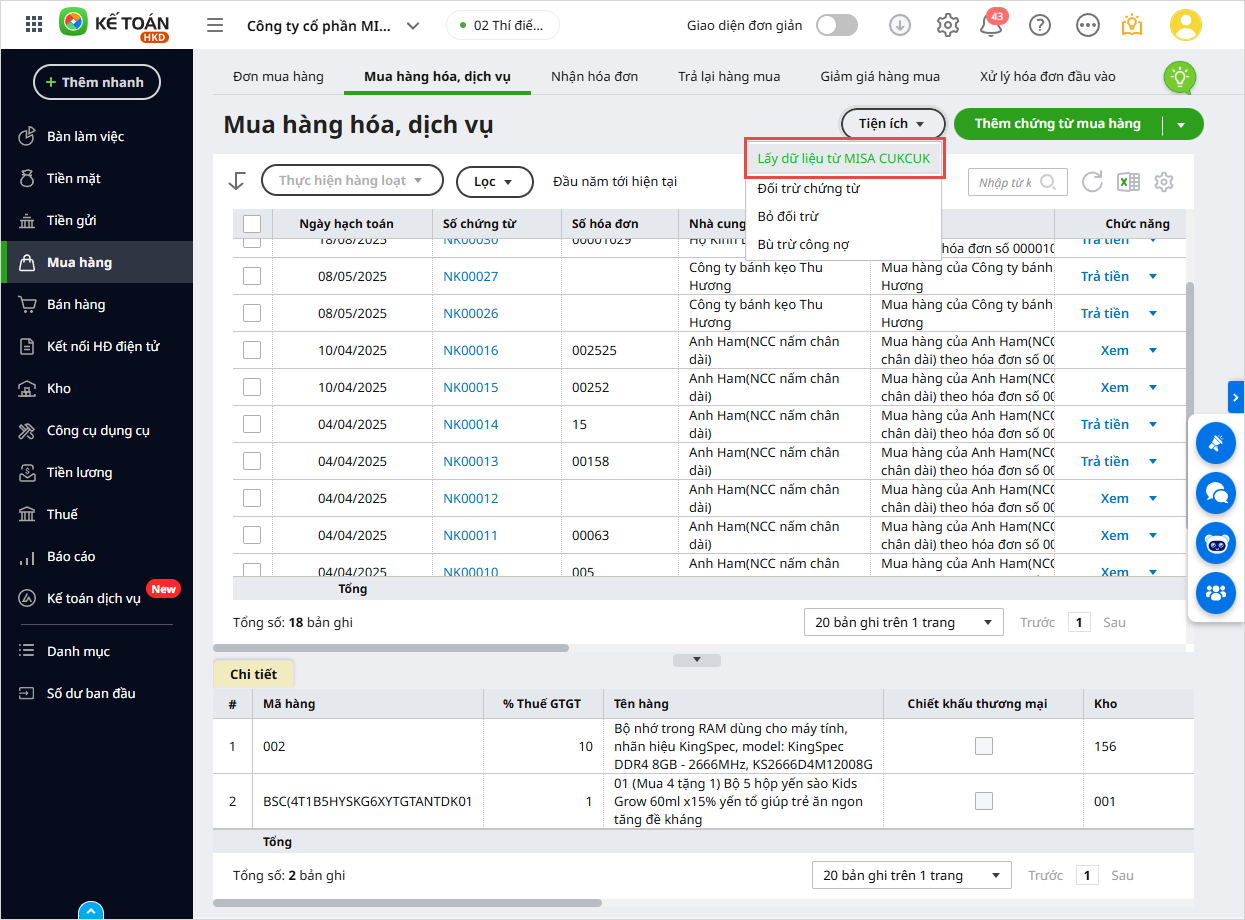 8. Người dùng có thể xem chi tiết các chứng từ được lấy về từ MISA CukCuk