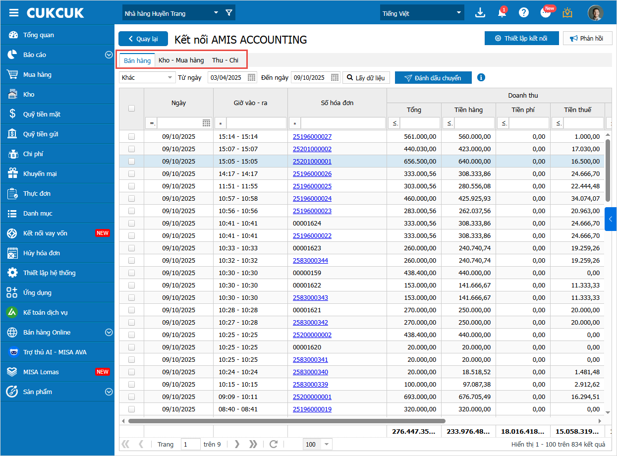 Sau khi thực hiện kết nối thành công, chương trình sẽ tự động đồng bộ dữ liệu, các loại chứng từ lấy được từ CukCuk sang AMIS Kế toán HKD, bao gồm: