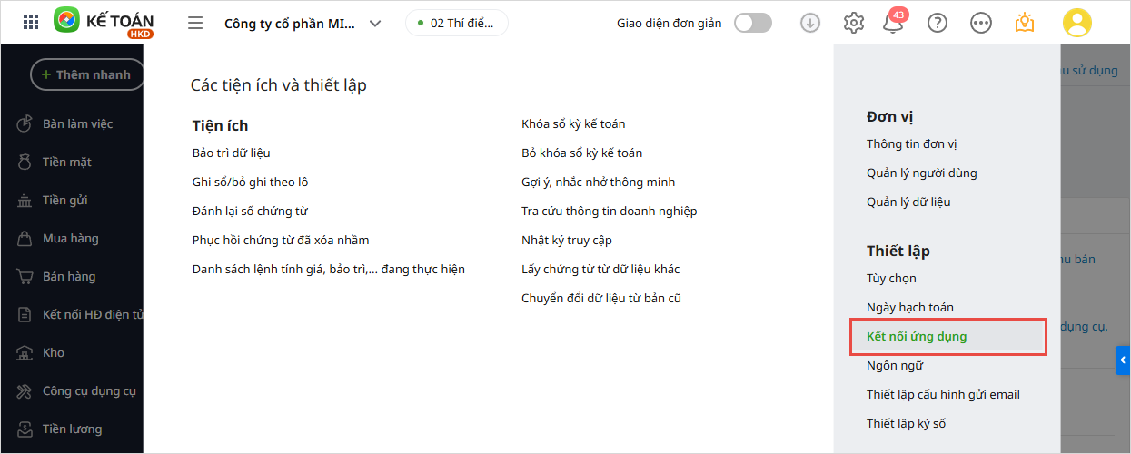 1. Đăng nhập vào ứng dụng AMIS Kế toán HKD, nhấn vào biểu tượng và chọn Thiết lập ứng dụng