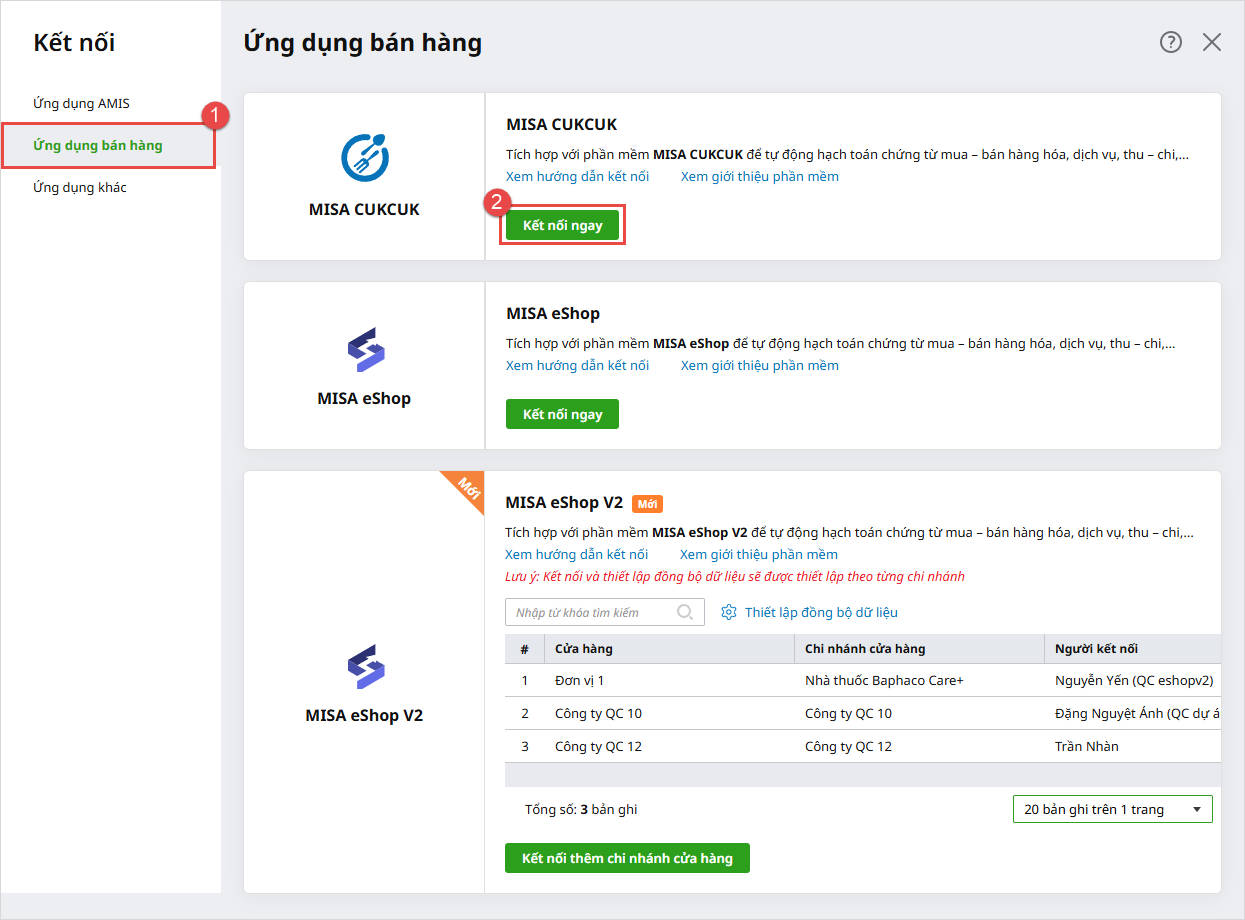 2. Chọn Ứng dụng bán hàng, tại ứng dụng MISA CukCuk, nhấn Kết nối ngay