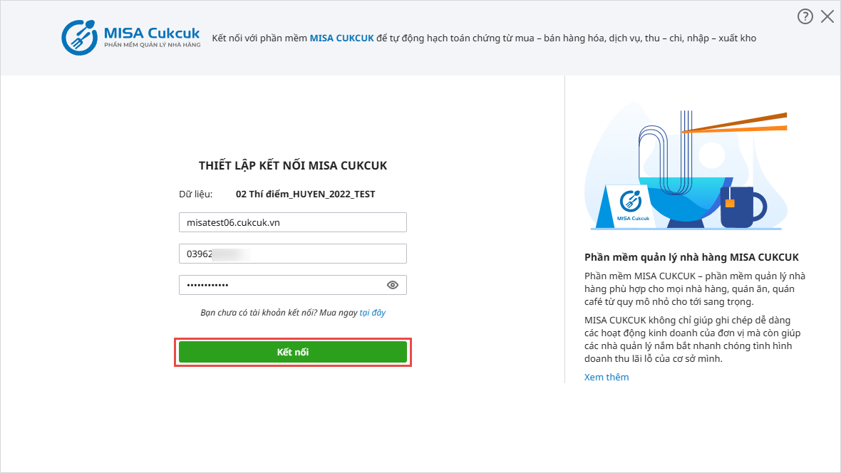 3. Nhập thông tin tài khoản kết nối, sau đó nhấn Kết nối.