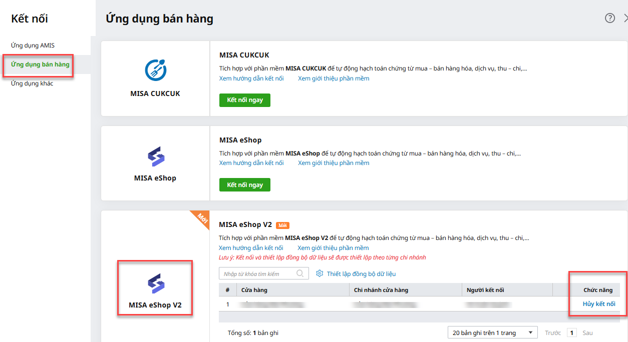 Lưu ý: Trường hợp anh/chị muốn hủy kết nối eShop V2 trên phần mềm AMIS Kế toán HKD thì vào phần bánh răng (⚙) và chọn Kết nối ứng dụng – tại Ứng dụng bán hàng – dòng ứng dụng MISA eShop V2, nhấn Hủy kết nối.