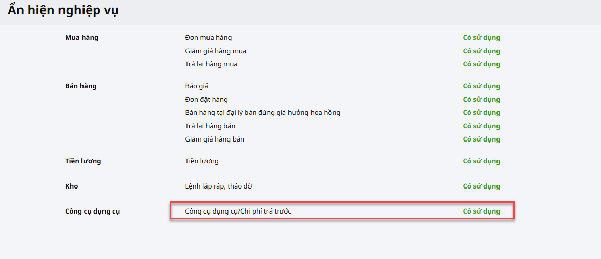 Lưu ý: Để hiển thị phân hệ Công cụ dụng cụ, anh/chị cần tích chọn Có sử dụng nghiệp vụ Công cụ dụng cụ/Chi phí trả trước trên Các tiện ích và Thiết lập/ Tùy chọn/ Ẩn hiện nghiệp vụ.