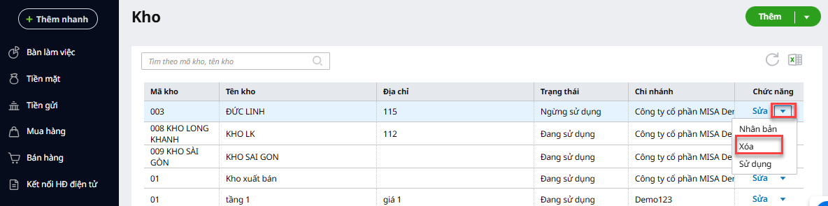 - Đối với các kho trùng/bị sai (chưa có phát sinh) không sử dụng nữa, có thể sử dụng chức năng Xóa.