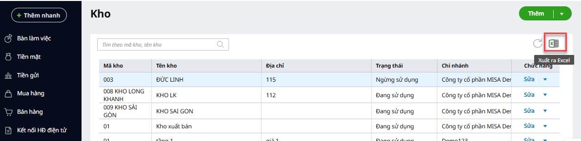 - Để xuất khẩu danh mục kho, nhấn chọn chức năng Xuất ra Excel.