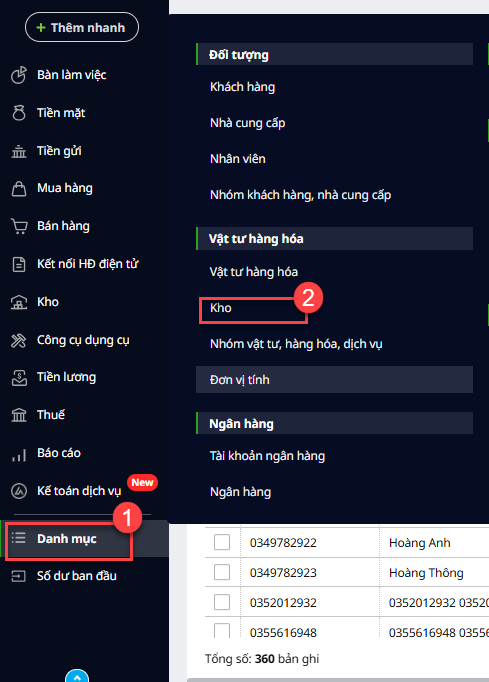 Bước 1: Vào Danh mục\Vật tư hàng hóa\Kho