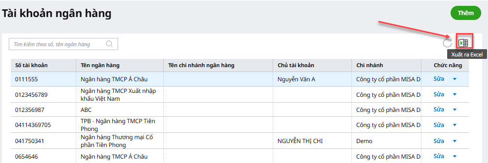 - Để xuất khẩu danh mục tài khoản ngân hàng, nhấn chọn chức năng Xuất ra Excel.