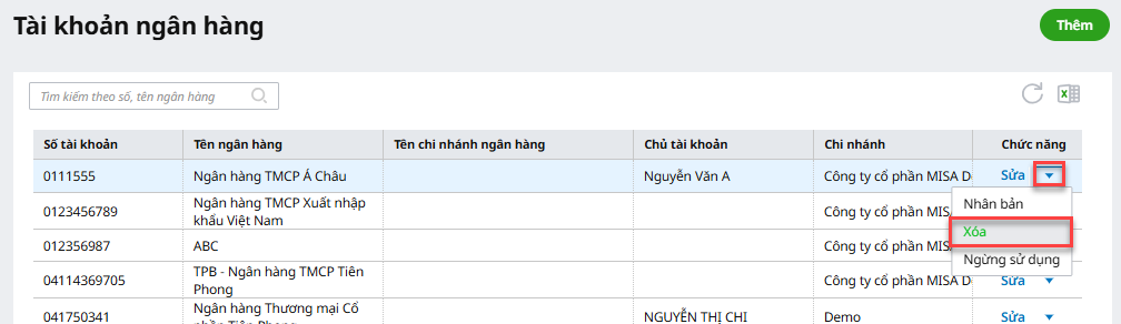 - Đối với các tài khoản ngân hàng trùng/bị sai (chưa có phát sinh) không sử dụng nữa, có thể sử dụng chức năng Xóa.