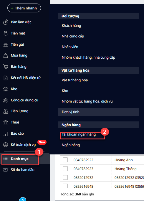 Bước 1: vào Danh mục\Ngân hàng\Tài khoản ngân hàng