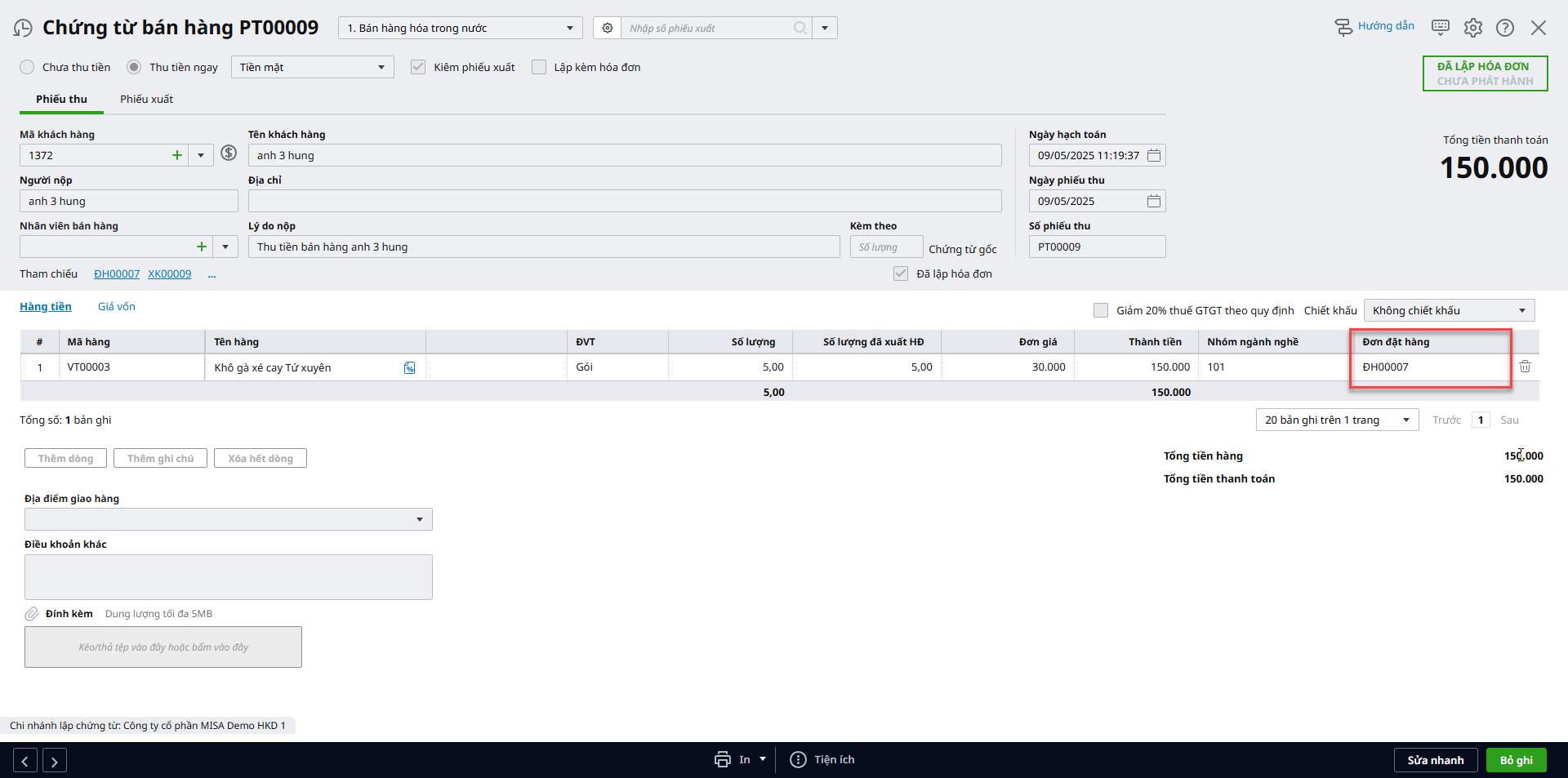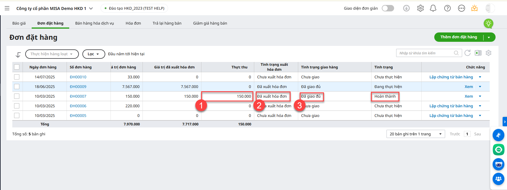 Điều kiện 1: Thực thu của đơn đặt hàng = Giá trị đơn hàng = Giá trị xuất hóa đơn