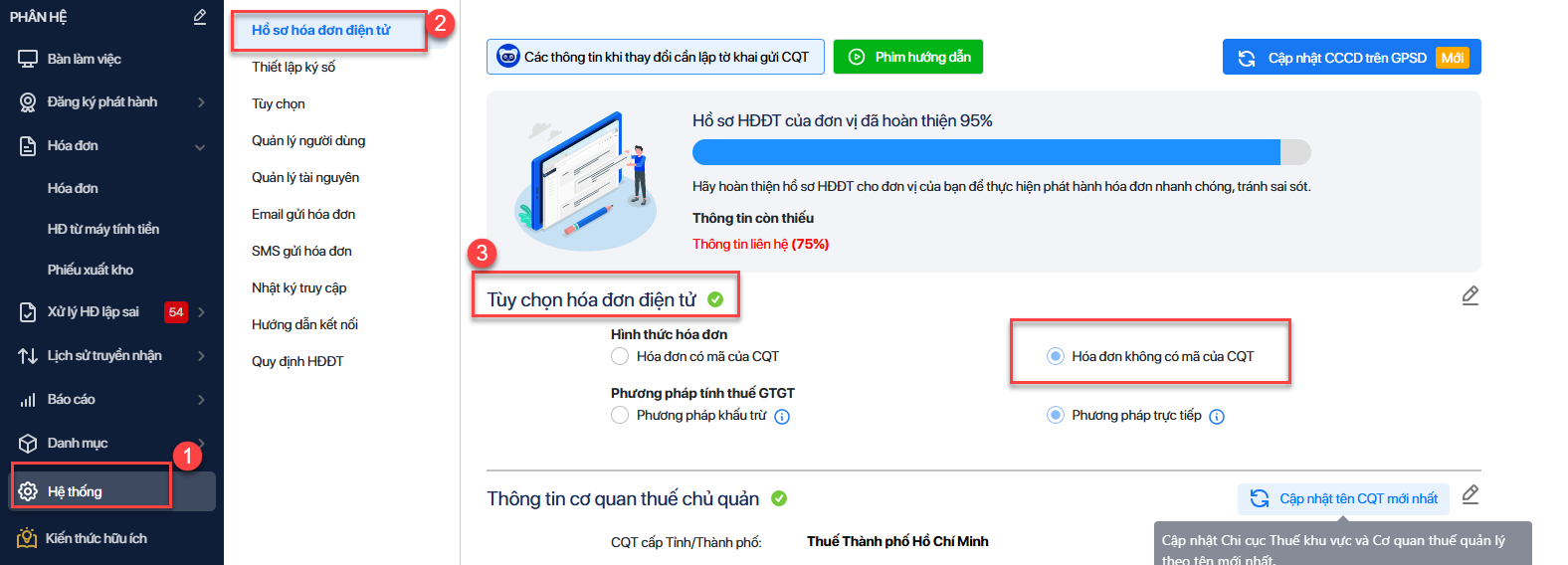 Bước 1: Đăng nhập vào phần mềm meinvoice.vn, sau đó vào mục Hệ thốngHồ sơ hóa đơn điện tửTùy chọn hóa đơn điện tử kiểm tra xem có bị nhảy về loại Hóa đơn không có mã CQT hay không.