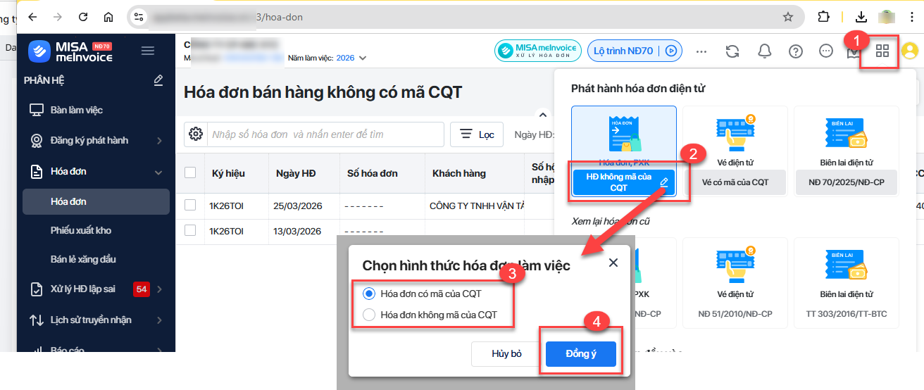 Bước 2: Vẫn trên giao diện của phần mềm MISA meInvoice, anh/chị tích chuột vào biểu tượng 4 ô vuông ở góc phải trên cùng, bên cạnh biểu tượng đăng nhập để kiểm tra hình thức hóa đơn. Nếu cũng đang chọn là HĐ không mã của CQT thì tích biểu tượng cây bút để chọn lại về Hóa đơn có mã của CQT sau đó nhấn Đồng ý.