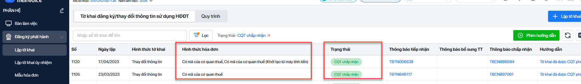 • Anh/chị cần đảm bảo tờ khai đăng ký Đăng ký/thay đổi thông tin sử dụng hóa đơn điện tử (01/ĐKTĐ-HĐĐT) đăng ký đúng hình thức hóa đơn Có mã của CQT, Có mã CQT khởi tạo từ máy tính tiền (nếu có) và trạng thái của tờ khai phải là CQT chấp nhận thì mới phát hành được hóa đơn. Trường hợp trạng thái tờ khai để là CQT đang xử lý TK thì anh/chị chờ thuế xử lý, khi nào trạng thái về chấp nhận thì lúc đó hãy phát hành hóa đơn.