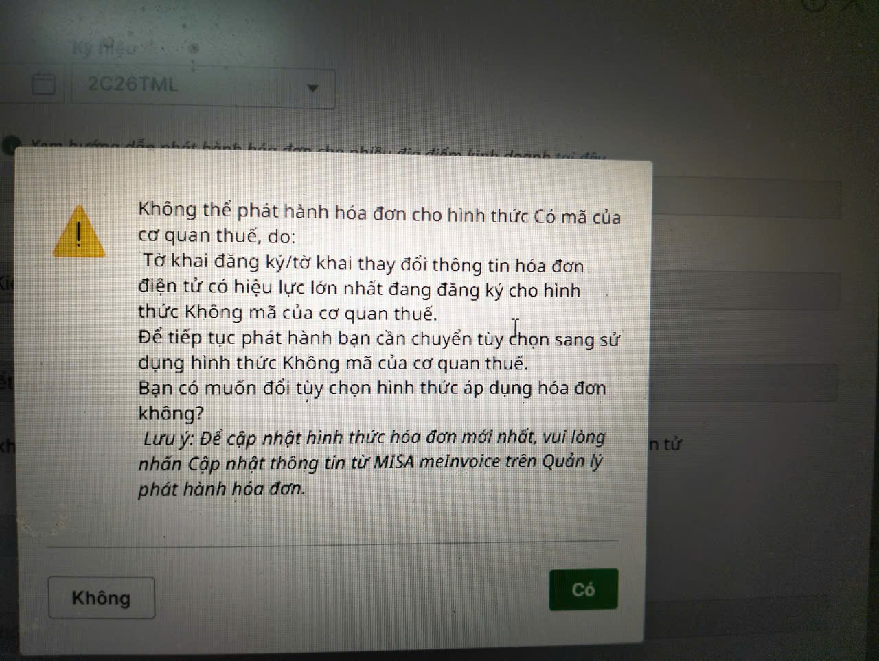 Bài viết hướng dẫn cách khắc phục trường hợp khi phát hành hóa đơn báo lỗi “Không thể phát hành hóa đơn cho hình thức Có mã của cơ quan thuế, do: Tờ khai đăng ký/tờ khai thay đổi thông tin hóa đơn điện tử có hiệu lực lớn nhất đang đăng ký cho hình thức Không mã của cơ quan thuế. Để tiếp tục phát hành bạn cần chuyển tùy chọn sang sử dụng hình thức Không mã của cơ quan thuế. Bạn có muốn đổi tùy chọn hình thức áp dụng hóa đơn không? Lưu ý: Để cập nhật hình thức hóa đơn mới nhất, vui lòng nhấn Cập nhật thông tin từ MISA meInvoice trên Quản lý phát hành hóa đơn.”