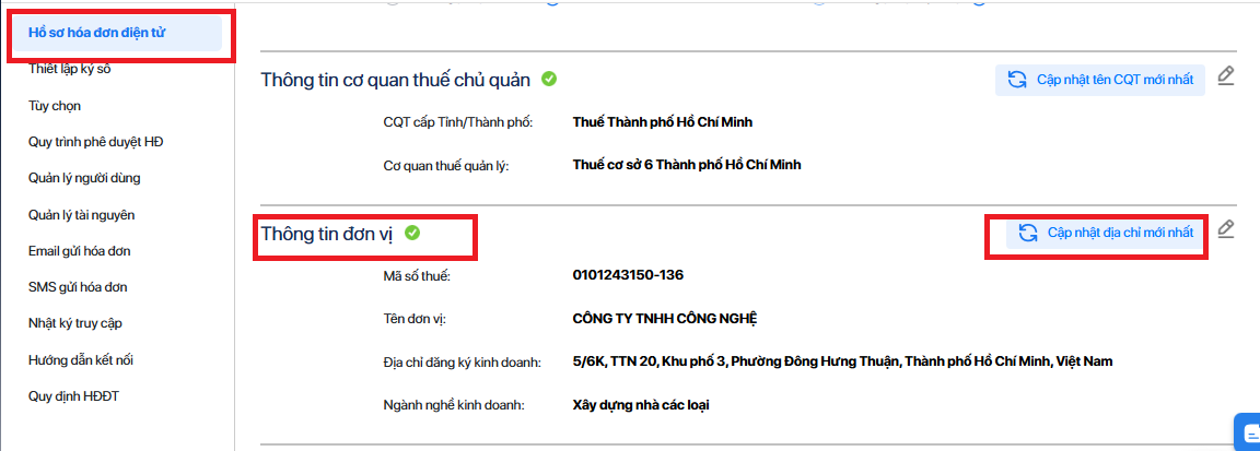 Bài viết hướng dẫn cập nhật địa chỉ hồ sơ hóa đơn điện tử theo địa chỉ mới nhất.