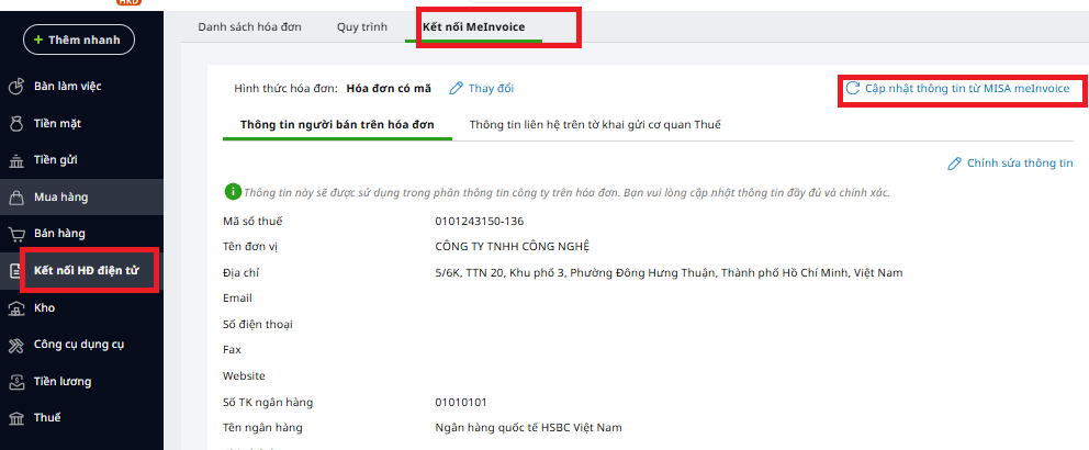 Bước 3: Về lại phần mềm AMIS Kế toán HKD, vào phân hệ Kết nối HĐ điện tử\ Kết nối MeInvoice chọn chức năng Cập nhật thông tin từ MISA meInvoice.