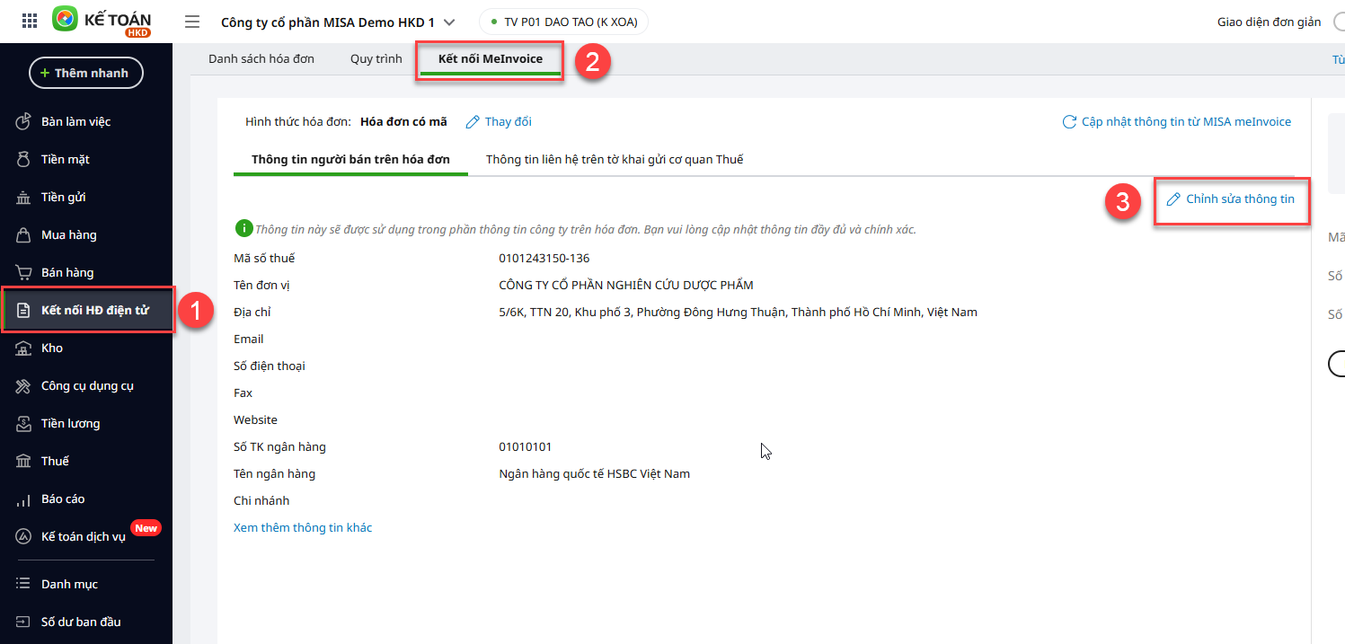 Bước 1: Trên AMIS Kế toán Hộ kinh doanh, vào phân hệ Kết nối HĐ điện tử\ Kết nối MeInvoice chọn chức năng Chỉnh sửa thông tin.