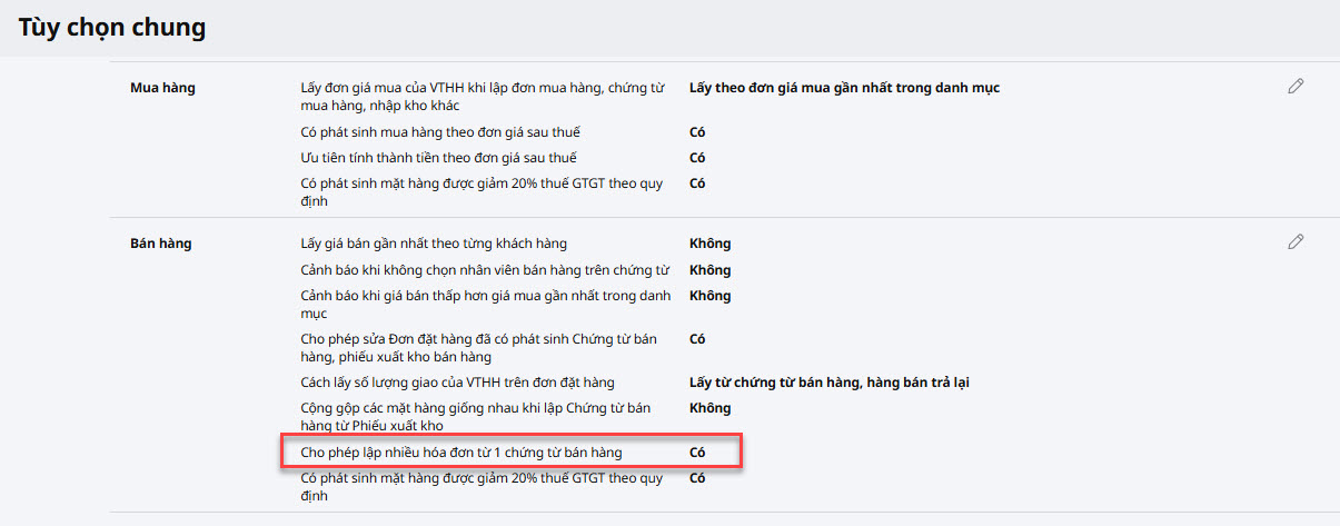 Bước 2: Tại tùy chọn Bán hàng: kiểm tra mục Cho phép lập nhiều hóa đơn từ 1 chứng từ bán hàng. Nếu muốn thay đổi thì anh/chị nhấn vào biểu tượng hình cây bút, chọn Có/Không theo nhu cầu và nhấn Cất.