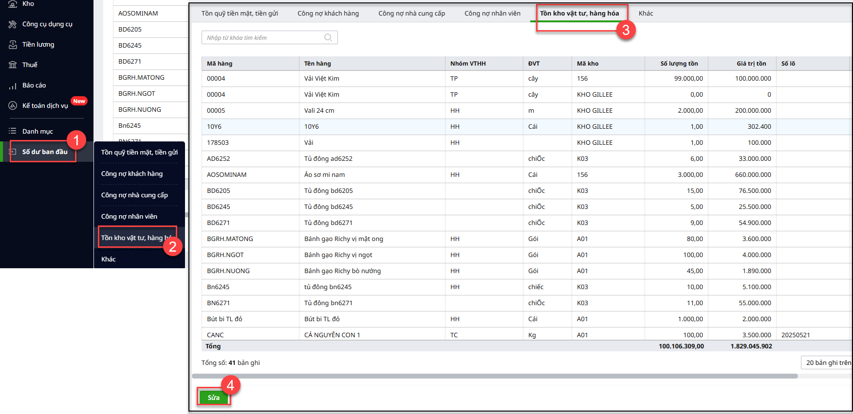 2.3. Nhập số dư tồn ban đầu của vật tư hàng hóaThực hiện nhập số dư tồn kho vật tư hàng hóa theo mã quy cách như sau: Bước 1: Vào Số dư ban đầu\ Tồn kho vật tư, hàng hóa\ Tồn kho vật tư, hàng hóa \Sửa