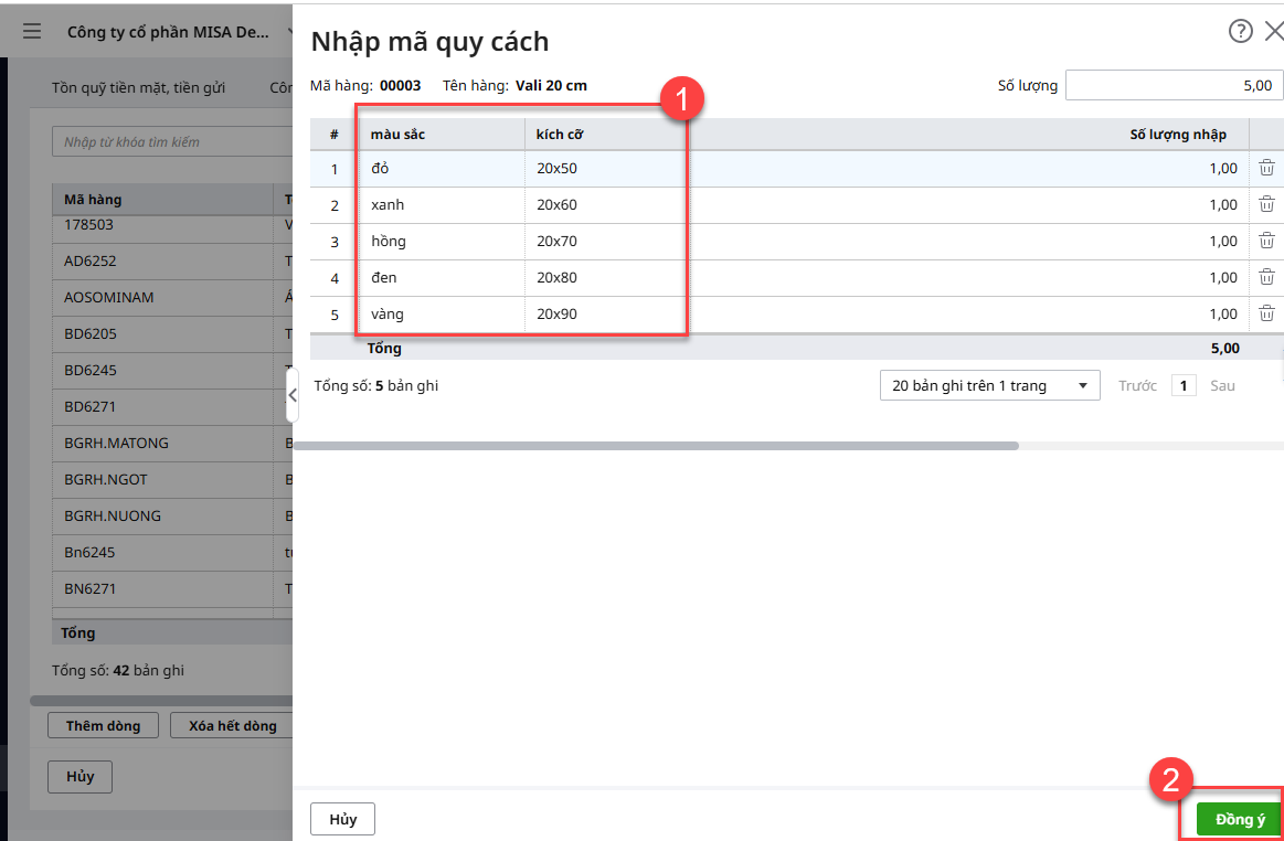 Bước 3: Nhập chi tiết thông tin mã quy cách cho các vật tư hàng hóa còn tồn, nhấn Đồng ý.